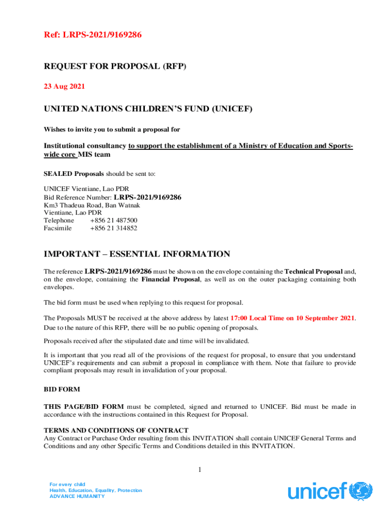 Ref: LRPS2021/9169286REQUEST FOR PROPOSAL (RFP) 23 Aug 2021UNITED NATIONS CHILDREN FUND (UNICEF) Wishes to invite you to submit a proposal constitutional consultancy to support the establishment of