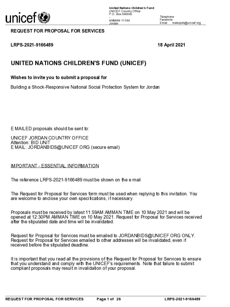 United Nations Children\'s Fund UNICEF Country Office P.O. Box 940043 Telephone Facsimile AMMAN 11194 Email maloqleh@unicef.org ___ JordanREQUEST FOR PROPOSAL FOR SERVICES LRPS2021916648918 April