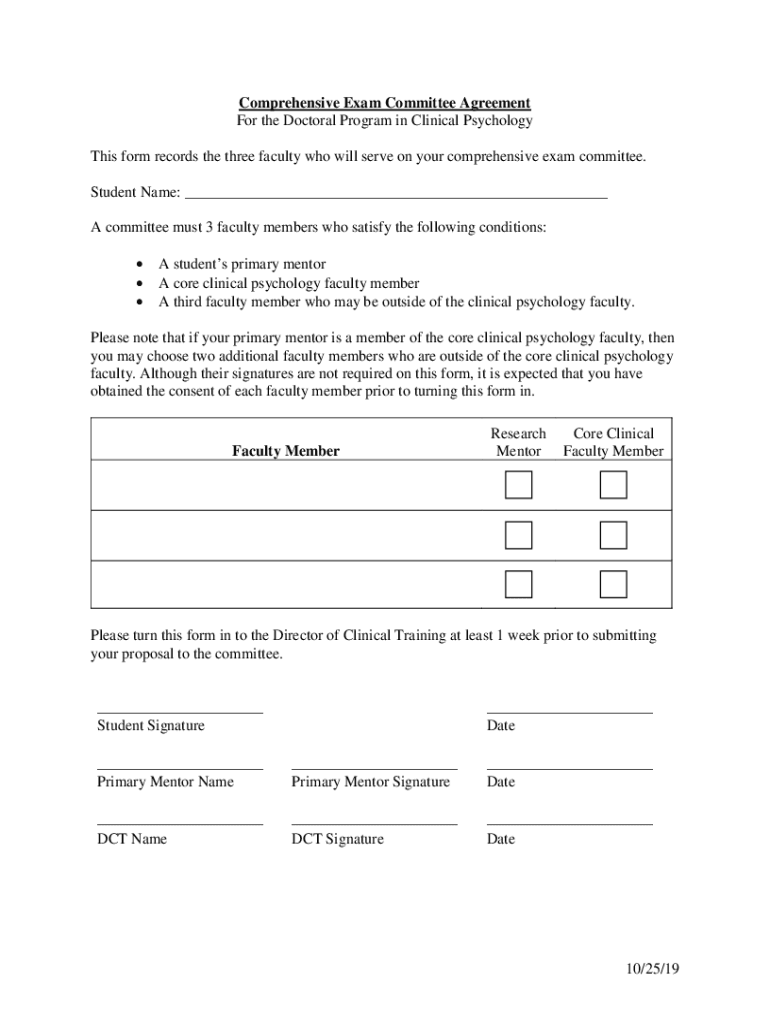 Comprehensive Exam Committee Agreement For the Doctoral Program in Clinical Psychology This form records the three faculty members who will serve on your comprehensive exam committee. Student Name: