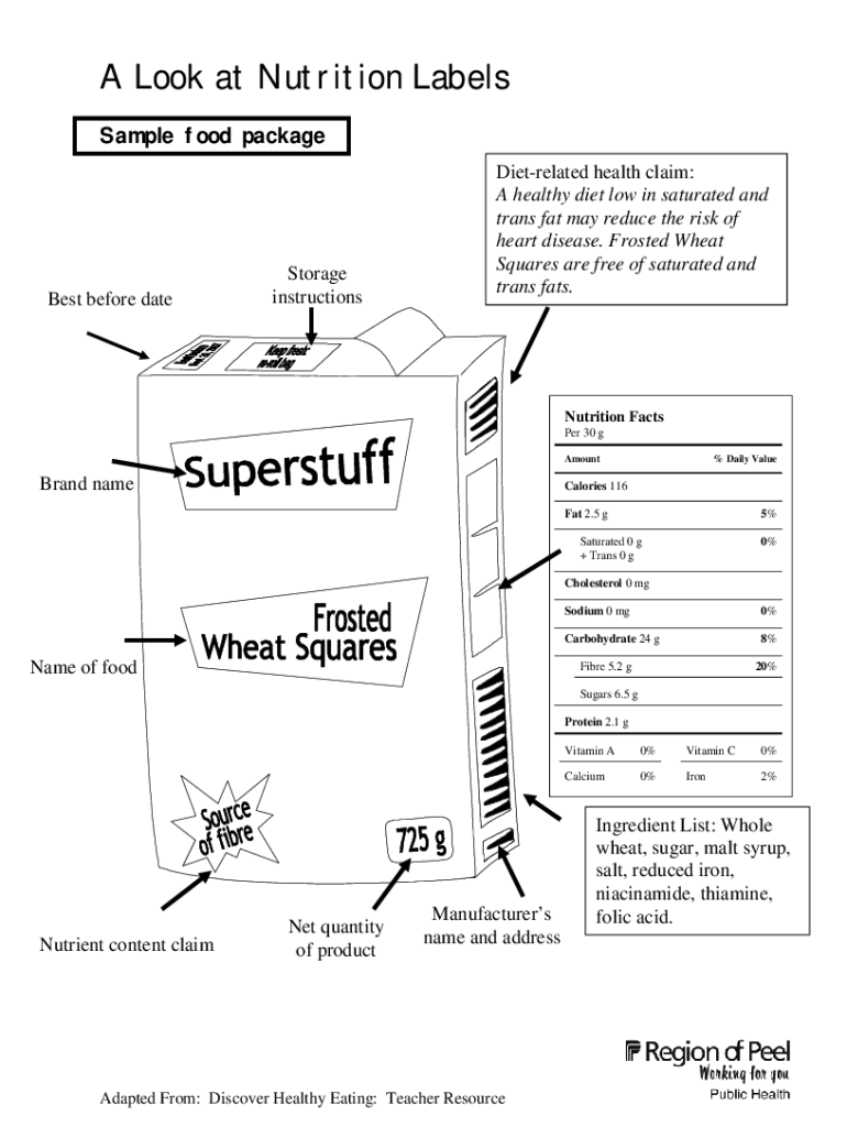 A Look at Nutrition Labels Sample food package Best before dateStorage instructionsDietrelated health claim: A healthy diet low in saturated and trans fat may reduce the risk of heart disease. Frosted