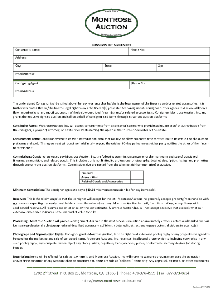 Consignors Name:CONSIGNMENT AGREEMENT Phone No.:Address: City:State:Zip:Email Address: Consigning Agent:Phone No.:Email Address:The undersigned Consignor (as identified above) hereby warrants that