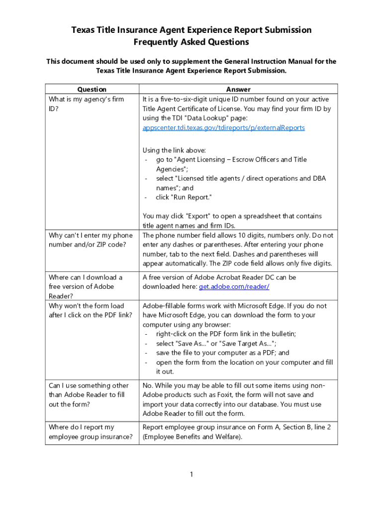Texas Title Insurance Agent Experience Report Submission Frequently Asked Questions This document should be used only to supplement the General Instruction Manual for the Texas Title Insurance Agent