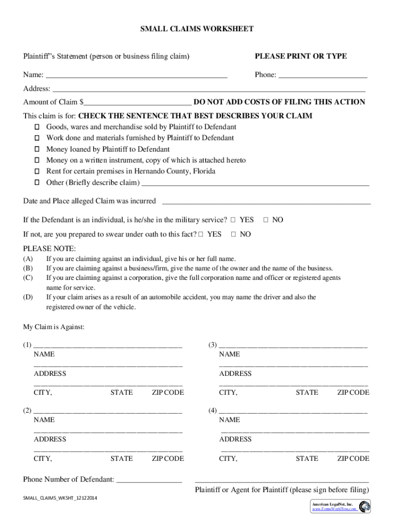 SMALL CLAIMS WORKSHEET Plaintiffs Statement (person or business filing claim)PLEASE PRINT OR Typeface: ___Phone: ___Address: ___ Amount of Claim $___ DO NOT ADD COSTS OF FILING THIS ACTION This claim