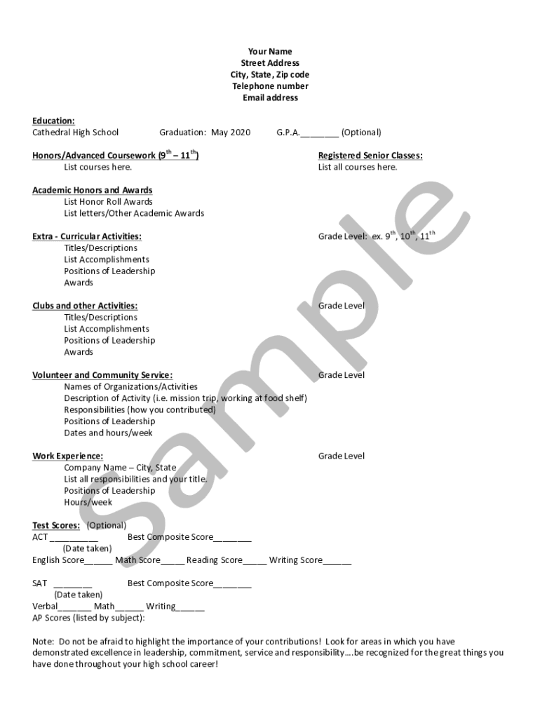 Your Backstreet Addressing, State, Zip codeTelephone numberEmail addressEducation:Cathedral High SchoolGraduation:May 2020G. P.A.___ (Optional)Honors/Advanced Coursework (9th 11th)Registered Senior Classes:List courses here.