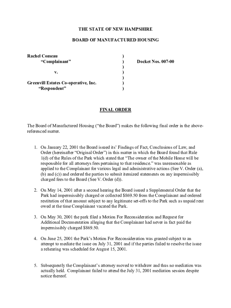 THE STATE OF NEW HAMPSHIRE BOARD OF MANUFACTURED HOUSING Rachel Come Complainant v. Greenville Estates Cooperative, Inc. Respondent)))))))Docket Nos. 00700FINAL ORDER The Board of Manufactured Housing