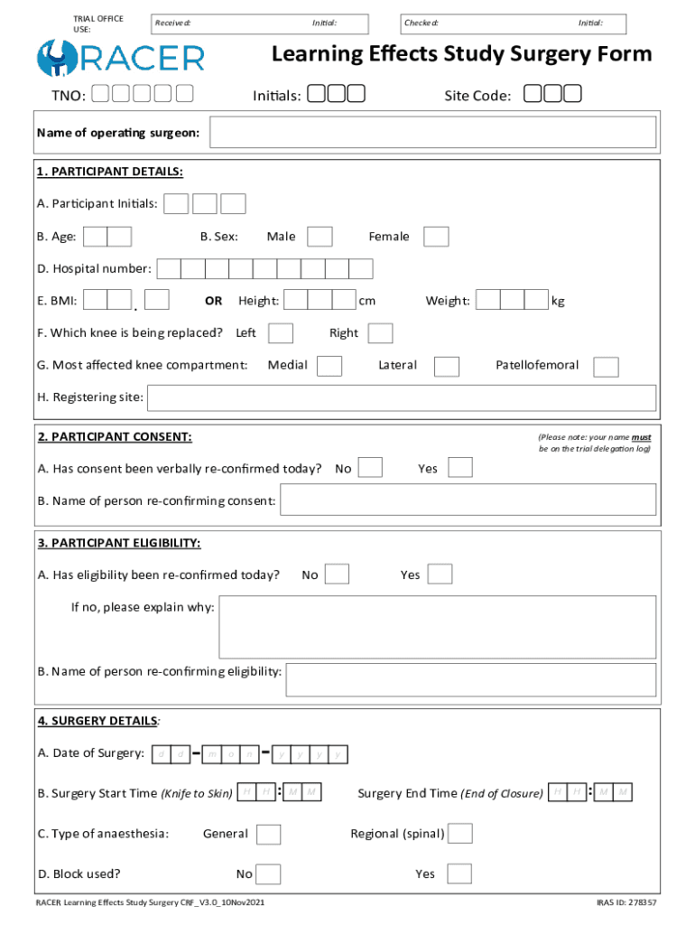 TRIAL OFFICE USE:Received:Initial:Checked:Initial:Learning Effects Study Surgery Form TNO:Initials:Site Code:Name of operating surgeon: 1. PARTICIPANT DETAILS: A. Participant Initials: B. Age:B. Sex:MaleFemaleD.