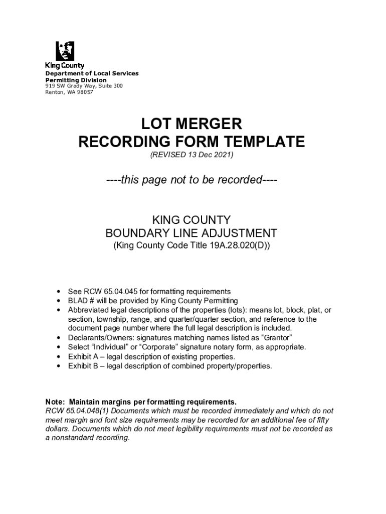 Department of Local Services Permitting Division 919 SW Grady Way, Suite 300 Renton, WA 98057LOT MERGER RECORDING FORM TEMPLATE (REVISED 13 Dec 2021)this page not to be recording COUNTY BOUNDARY LINE