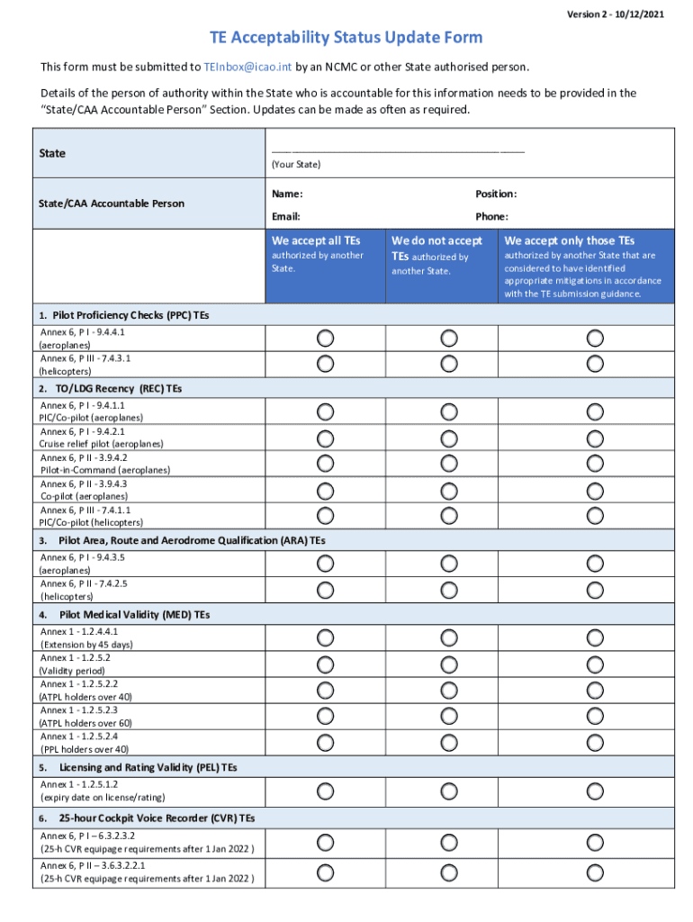 Version 2 10/12/2021TE Acceptability Status Update Form This form must be submitted to TEInbox@icao.int by an CMC or other State authorized person. Details of the person of authority within the State