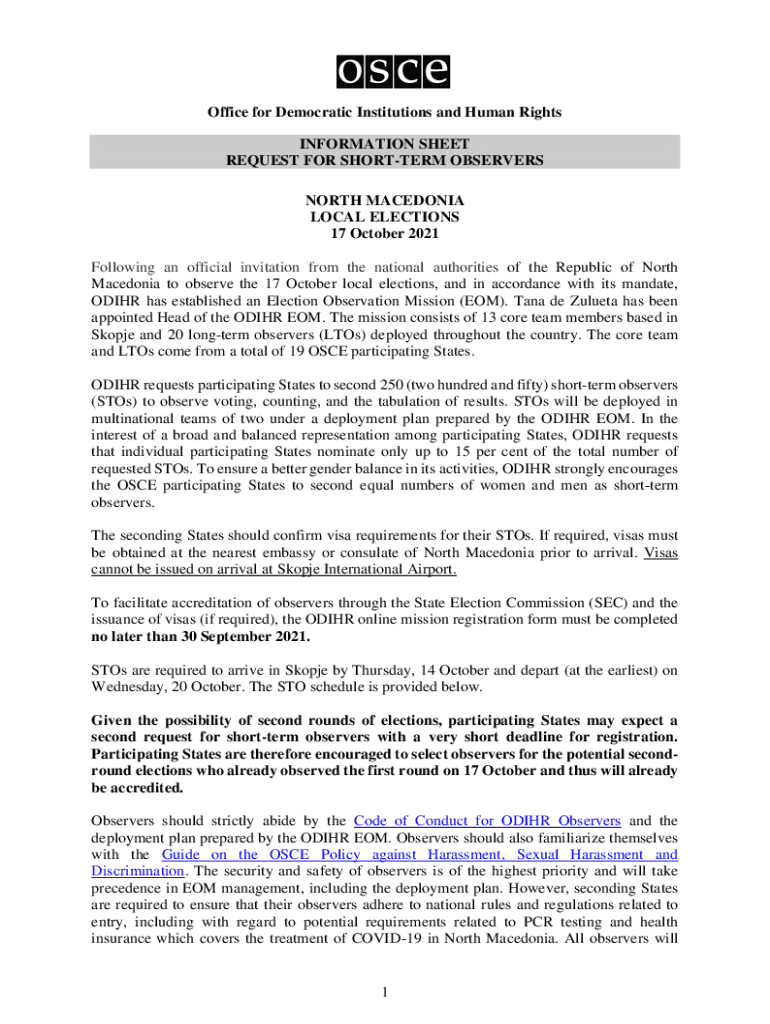 Office for Democratic Institutions and Human Rights INFORMATION SHEET REQUEST FOR SHORTER OBSERVERS NORTH MACEDONIA LOCAL ELECTIONS 17 October 2021 Following an official invitation from the national