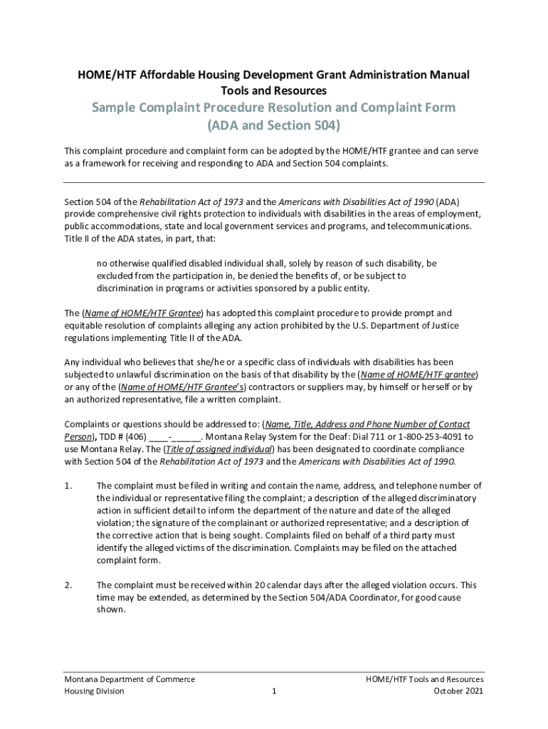 HOME/HTF Affordable Housing Development Grant Administration Manual Tools and ResourcesSample Complaint Procedure Resolution and Complaint Form (ADA and Section 504) This complaint procedure and complaint