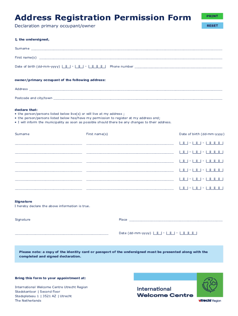 Address Registration Permission FormPRINTDeclaration primary occupant/ownerRESETI, the undersigned, Surname ___ First name(s) ___ Date of birth (ddmmyyyy)Phone number ___owner/primary occupant of