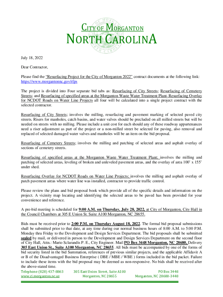 July 18, 2022, Dear Contractor, CITY OF MORGANTOWN NORTH CAROLINAPlease find the Resurfacing Project for the City of Morgantown 2022 contract documents at the following link: https://www.morgantonnc.gov/rfps