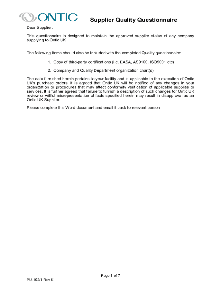 Supplier Quality Questionnaire Dear Supplier, This questionnaire is designed to maintain the approved supplier status of any company supplying to Optic UK The following items should also be included