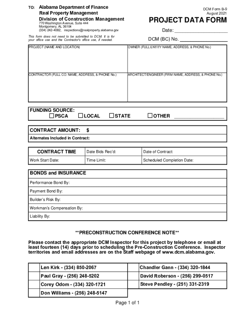 TO:Alabama Department of Finance Real Property Management Division of Construction Management DCM Form B9 August 2021PROJECT DATA FORM770 Washington Avenue, Suite 444 Montgomery, AL 36104 (334) 2424082,
