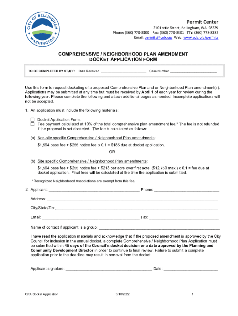 Permit Center 210 Lottie Street, Bellingham, WA 98225 Phone: (360) 7788300 Fax: (360) 7788301 TTY: (360) 7788382 Email: permits@cob.org Web: www.cob.org/permitsCOMPREHENSIVE / NEIGHBORHOOD PLAN AMENDMENT