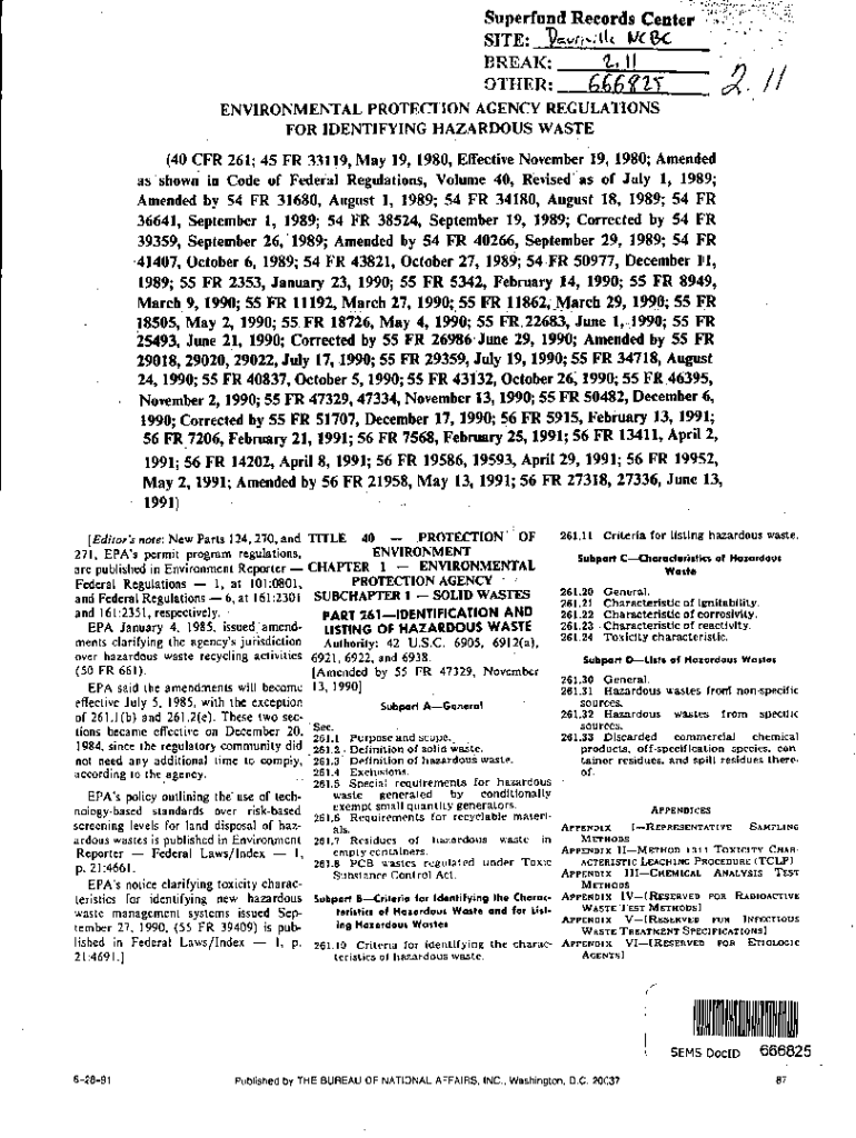 Superfund Records Cent; SITE: \')._., n, all, ;C BREAK: \'2., If OTHER: 666f2Y:’t\': :st\'.\'. .:!. //ENVIRONMENTAL PROTECTION AGENCY REGULATIONS FOR IDENTIFYING HAZARDOUS WASTE (40 CFR 261; 45