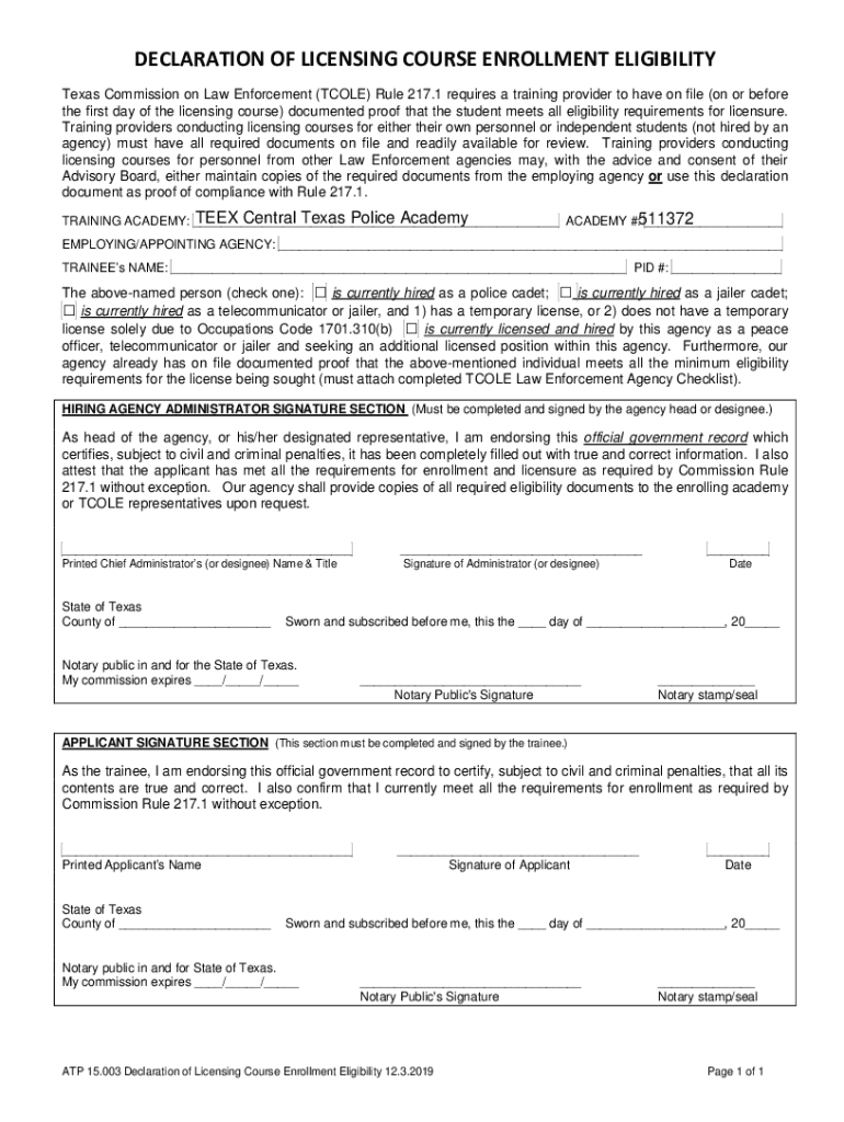 DECLARATION OF LICENSING COURSE ENROLLMENT ELIGIBILITY Texas Commission on Law Enforcement (COLE) Rule 217.1 requires a training provider to have on file (on or before the first day of the licensing