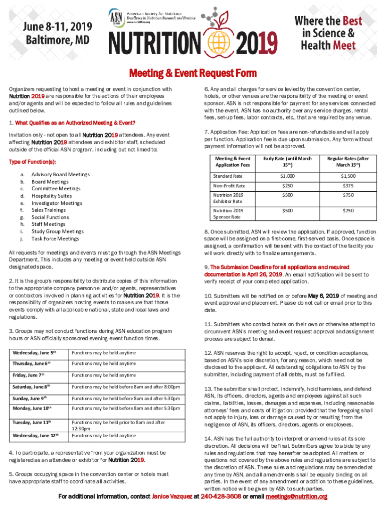 Meeting & Event Request Form Organizers requesting to host a meeting or event in conjunction with Nutrition 2019 are responsible for the actions of their employees and/or agents and will be expected