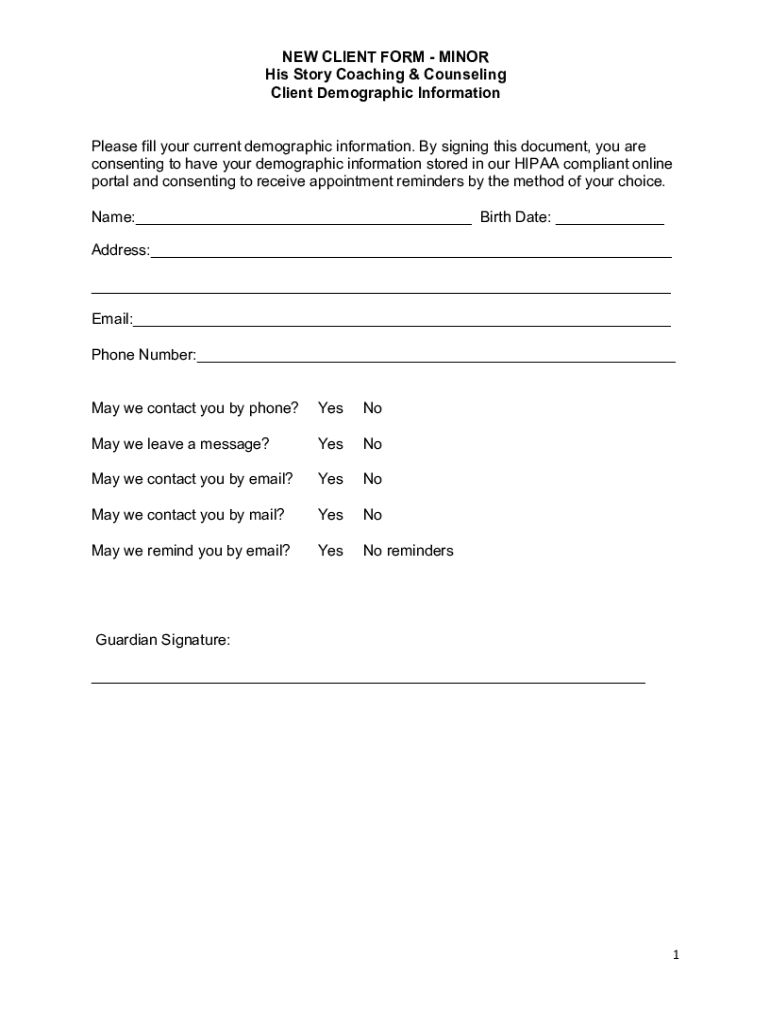 NEW CLIENT FORM MINOR His Story Coaching & Counseling Client Demographic Information Please fill your current demographic information. By signing this document, you are consenting to have your demographic