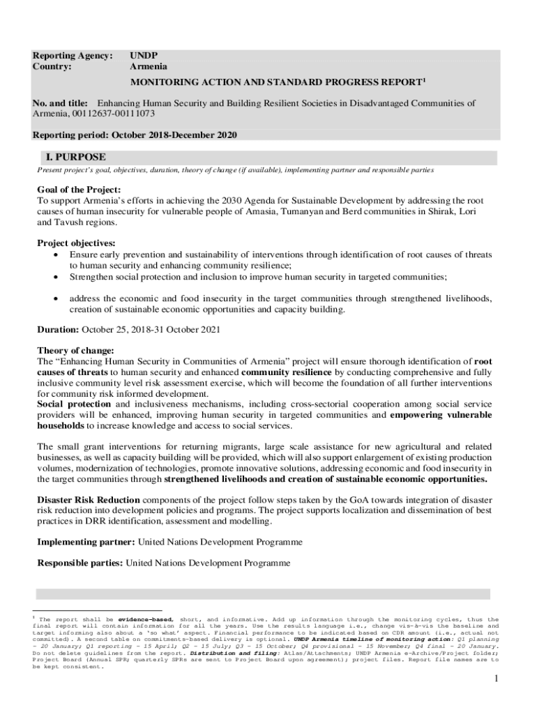 Reporting Agency: Country:UNDP Armenia MONITORING ACTION AND STANDARD PROGRESS REPORT 1No. And title: Enhancing Human Security and Building Resilient Societies in Disadvantaged Communities of Armenia,