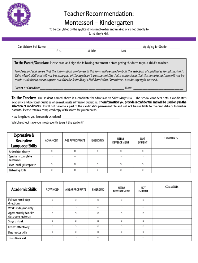 Teacher Recommendation: Montessori Kindergarten To be completed by the applicants current teacher and emailed or mailed directly to Saint Mary's Hall. Candidates Full Name: ___ Applying for Grade: