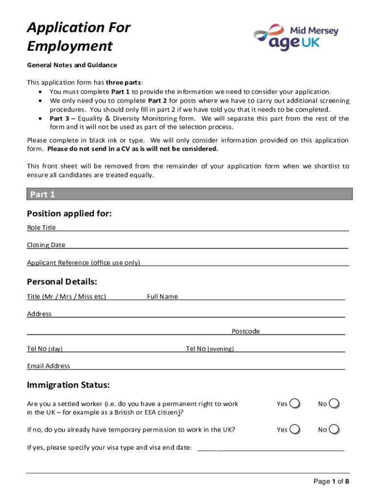 Application For Employment General Notes and Guidance This application form has three parts: You must complete Part 1 to provide the information we need to consider your application. We only need