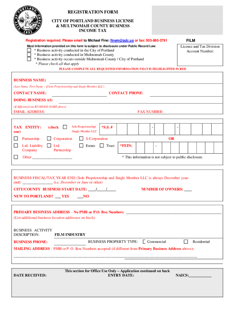 PLEASE RETURN THIS FORM TO:REGISTRATION Ferocity of Portland Revenue Bureau, License and Tax Division 111 SW Columbia St., Suite 600 Portland, OR 97201 (503) 8235157CITY OF PORTLAND BUSINESS LICENSE