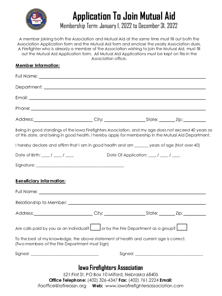 Application To Join Mutual Membership Term: January 1, 2022, to December 31, 2022, A member joining both the Association and Mutual Aid at the same time must fill out both the Association Application