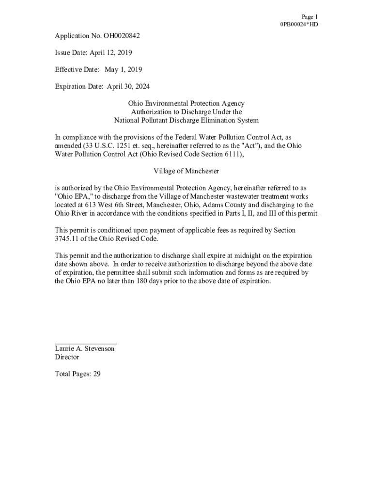 Page 1 0PB00024×Application No. OH0020842 Issue Date: April 12, 2019, Effective Date: May 1, 2019, Expiration Date: April 30, 2024 Ohio Environmental Protection Agency Authorization to Discharge
