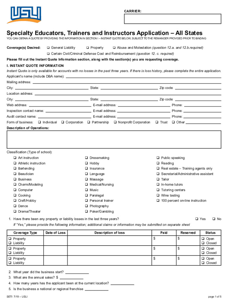 CARRIER:Specialty Educators, Trainers and Instructors Application All States CAN OBTAIN A QUOTE BY PROVIDING THE INFORMATION IN SECTION I Instantly QUOTE BELOW, SUBJECT TO THE REMAINDER PROVIDED PRIOR
