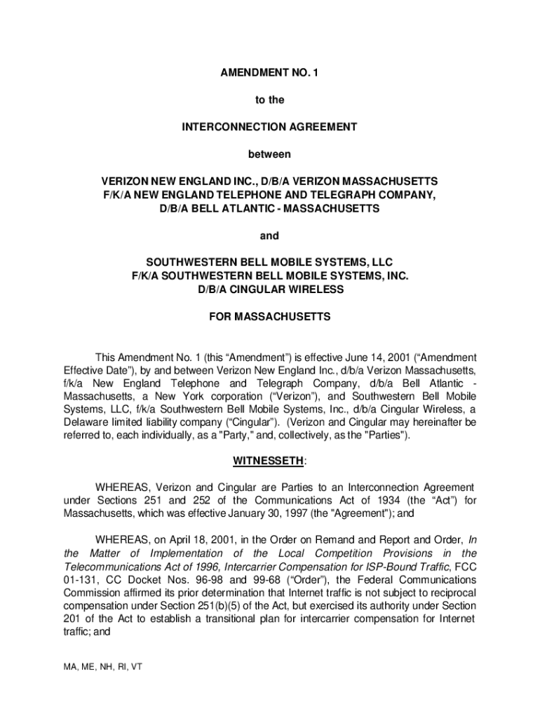 Get the free AMENDMENT NO. 1 to the INTERCONNECTION AGREEMENT between VERIZON NEW ...