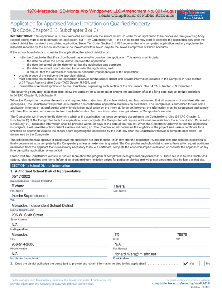 1976Mercedes ISD Monte Alto Wind power, Amendment No. 001August 10, 2022Tab 1 See executed application attached. Attachment to Application for 313 Appraised Value Limitation by Monte Alto Wind power,