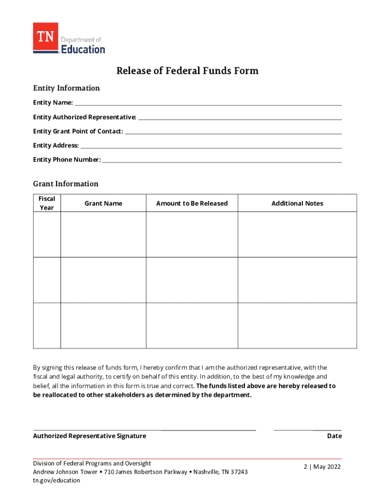 Release of Federal Funds Form Overview An entity who decides to release federal funds, must complete the release of federal funds form. The amount of funds entered by the entity will be removed from