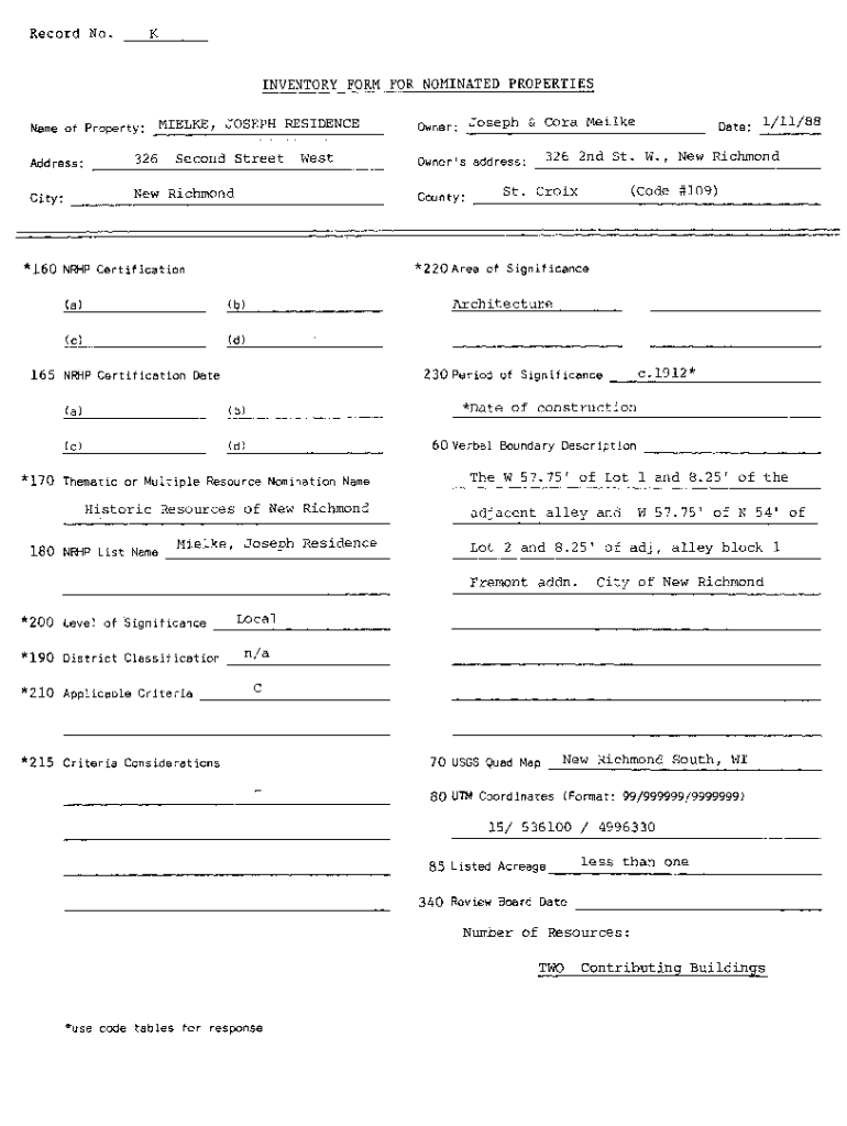 INVENTORY FORM FOR NOMINATED PROPERTIESName of Property: MILE, JOSEPH RESIDENCEOwner: Joseph & Cora Me headdress:326Owner\'s address:City: ___New RichmondSecond StreetWestCounty:326 2nd