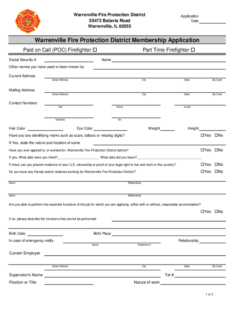 DateWarrenville Fire Protection District Membership Application