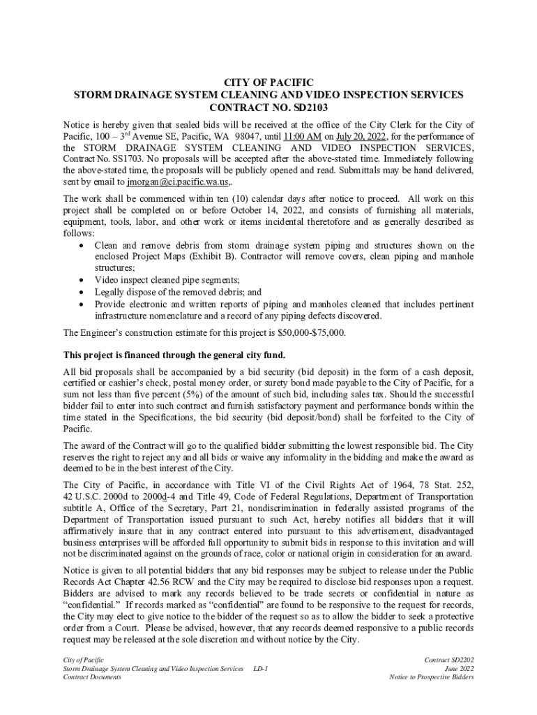 CITY OF PACIFIC STORM DRAINAGE SYSTEM CLEANING AND VIDEO INSPECTION SERVICES CONTRACT NO. SD2103 Notice is hereby given that sealed bids will be received at the office of the City Clerk for the City