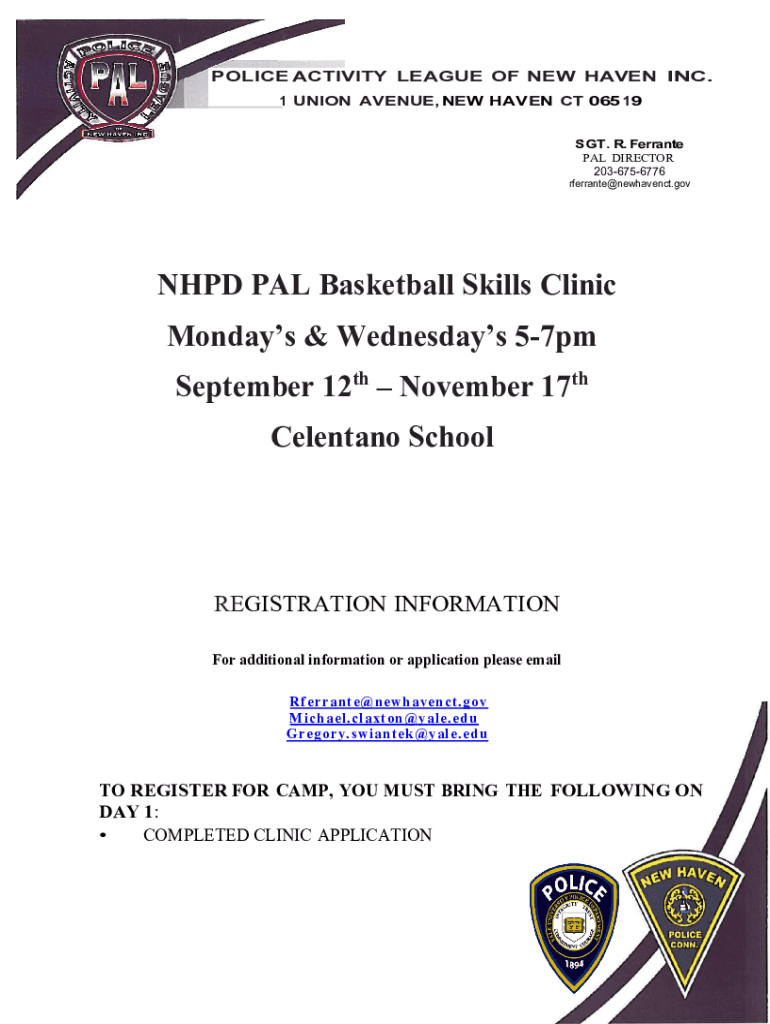 POLICE ACTIVITY LEAGUE OF NEW HAVEN INC. 1 UNION AVENUE, NEW HAD EN CT 065 19 SGT. R. Errant PAL DIRECTOR 2036756776rferrante@newhavenct.govNHPD PAL Basketball Skills Clinic Mondays & Wednesdays 57pm