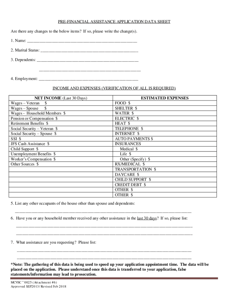 FINANCIAL ASSISTANCE APPLICATION DATA SHEET Are there any changes to the below items? If so, please write the change(s). 1. Name: ___ 2. Marital Status: ___ 3. Dependents: ___ ___ 4. Employment: ___