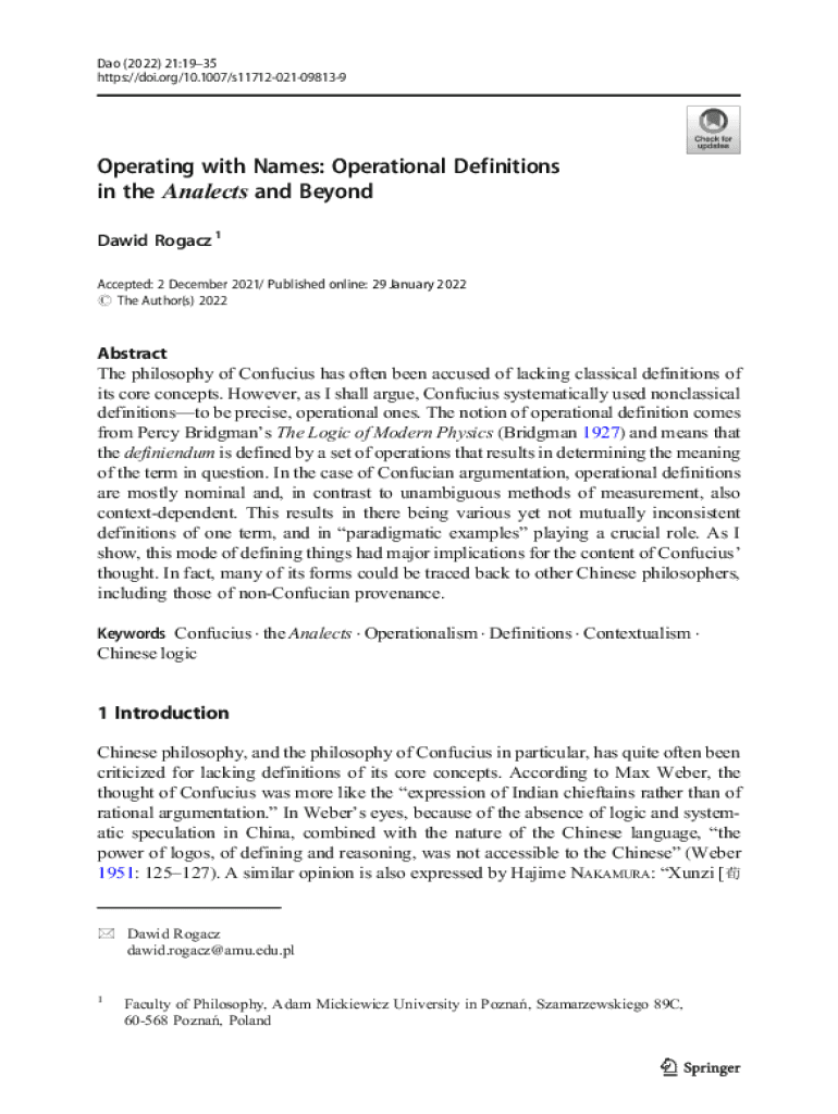 Day (2022) 21:1935 https://doi.org/10.1007/s11712021098139Operating with Names: Operational Definitions in the Analects and Beyond David Roach 1 Accepted: 2 December 2021/ Published online: 29 January