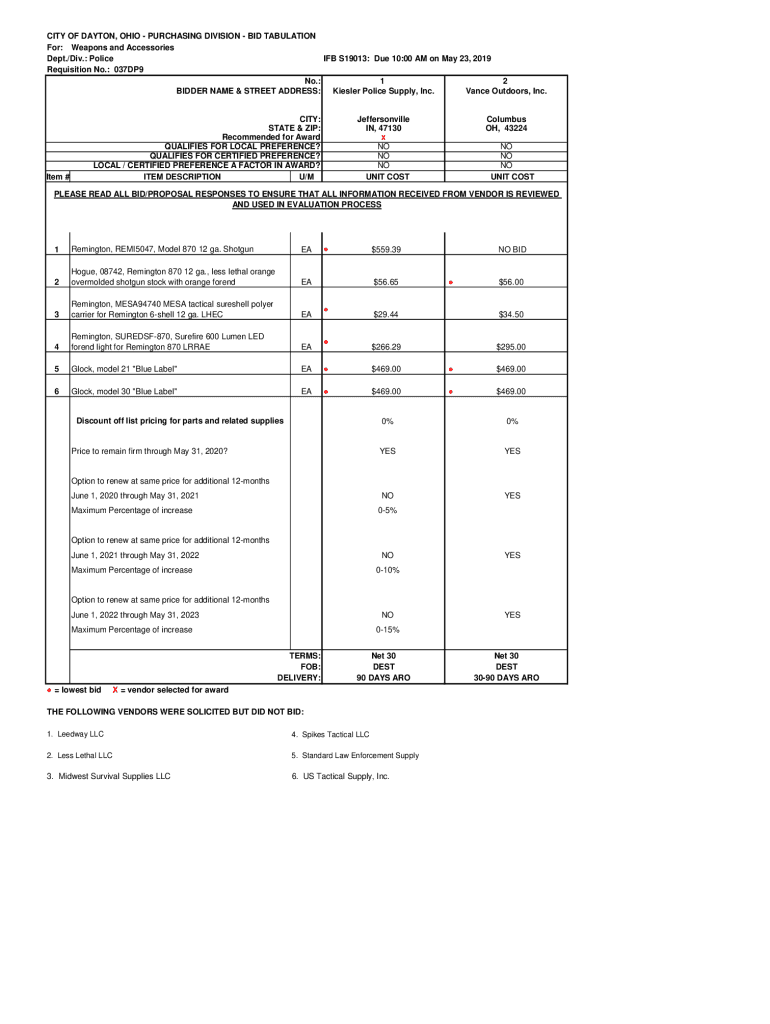 CITY OF DAYTON, OHIO PURCHASING DIVISION BID TABULATION For: Weapons and Accessories Dept./Div.: Police IF S19013: Due 10:00 AM on May 23, 2019, Requisition No.: 037DP9 1 2 No.: BIDDER NAME & STREET