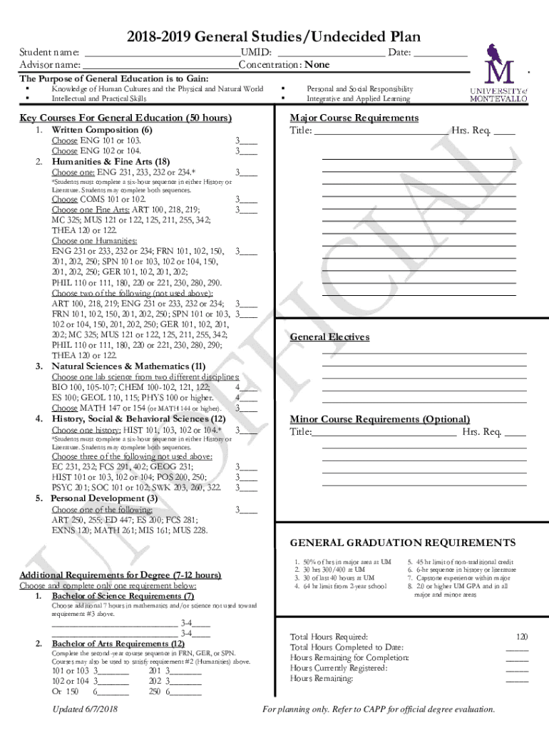 20182019 General Studies/Undecided PlanStudent name: ___MID: ___ Date: ___ Advisor name: ___Concentration: None The Purpose of General Education is to Gain:Knowledge of Human Cultures and the Physical