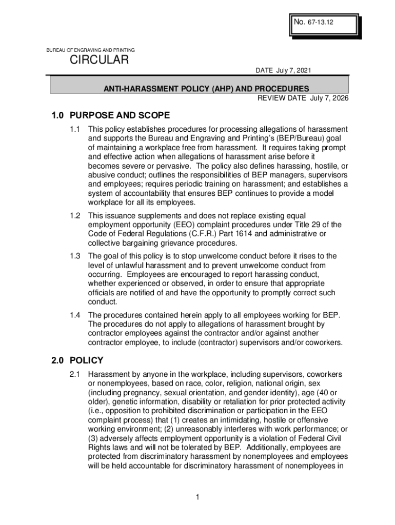 No. 6713.12BUREAU OF ENGRAVING AND PRINTINGCIRCULAR DATE July 7, 2021ANTIHARASSMENT POLICY (HP) AND PROCEDURES REVIEW DATE July 7, 20261.0 PURPOSE AND SCOPE 1.1This policy establishes procedures for