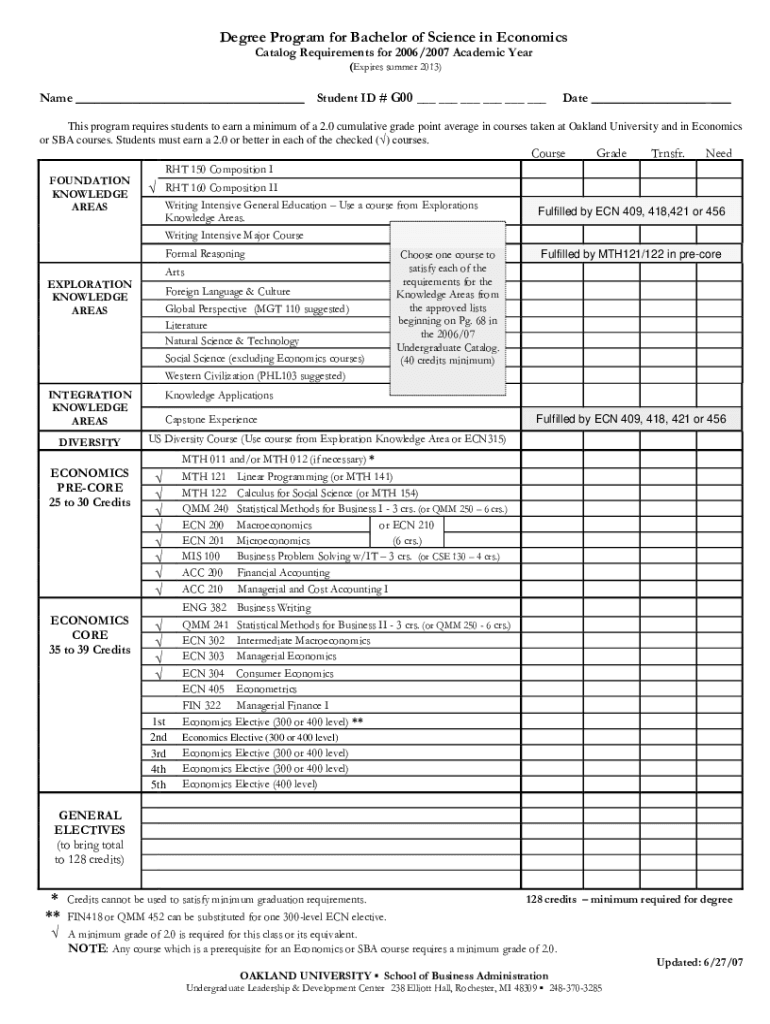 Degree Program for Bachelor of Science in Economics Catalog Requirements for 2006/2007 Academic Year (Expires summer 2013)Name ___Student ID # G00 ___ ___ ___ ___ ___ ___Date ___ ___This program requires