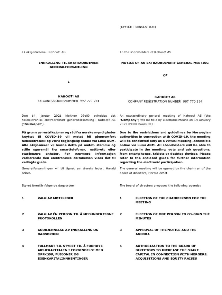 (OFFICE TRANSLATION)Til aksjonrene i Kahoot! Auto the shareholders of Kahoot! SIGNALLING TIL EKSTRAORDINRNOTICE OF AN EXTRAORDINARY GENERAL MEETINGGENERALFORSAMLING OF IDen14.KAHOOT! KAHOOT! ASORGANISASJONSNUMMER