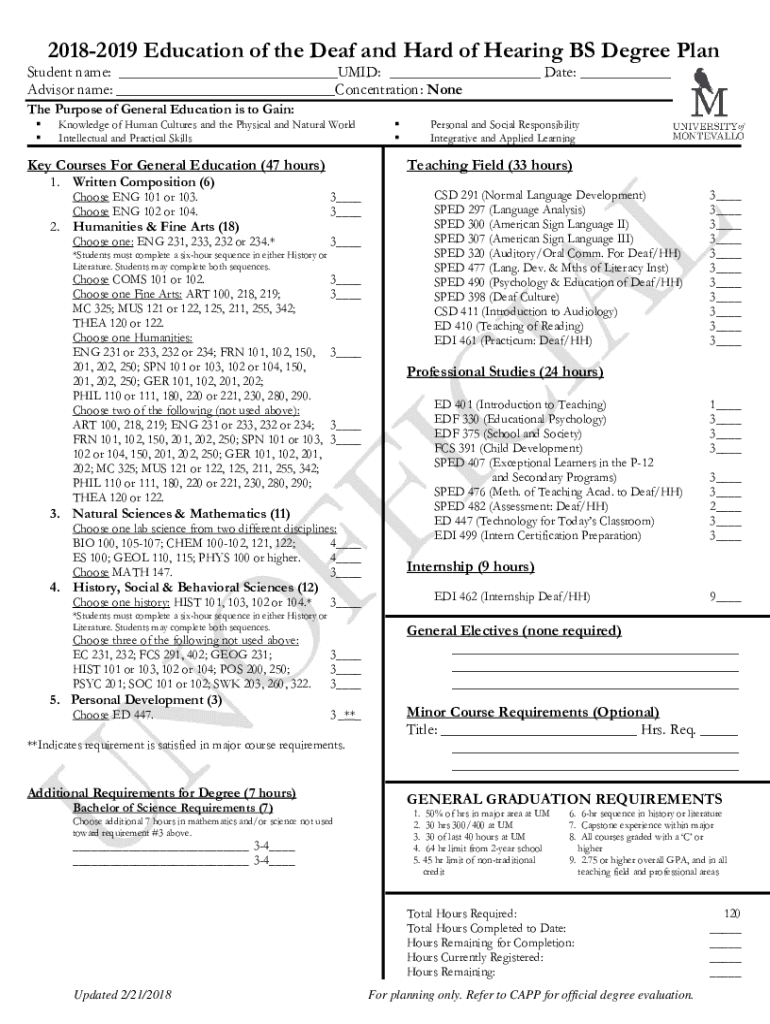 20182019 Education of the Deaf and Hard of Hearing BS Degree PlanStudent name: ___MID: ___ Date: ___ Advisor name: ___Concentration: None The Purpose of General Education is to Gain: Knowledge of