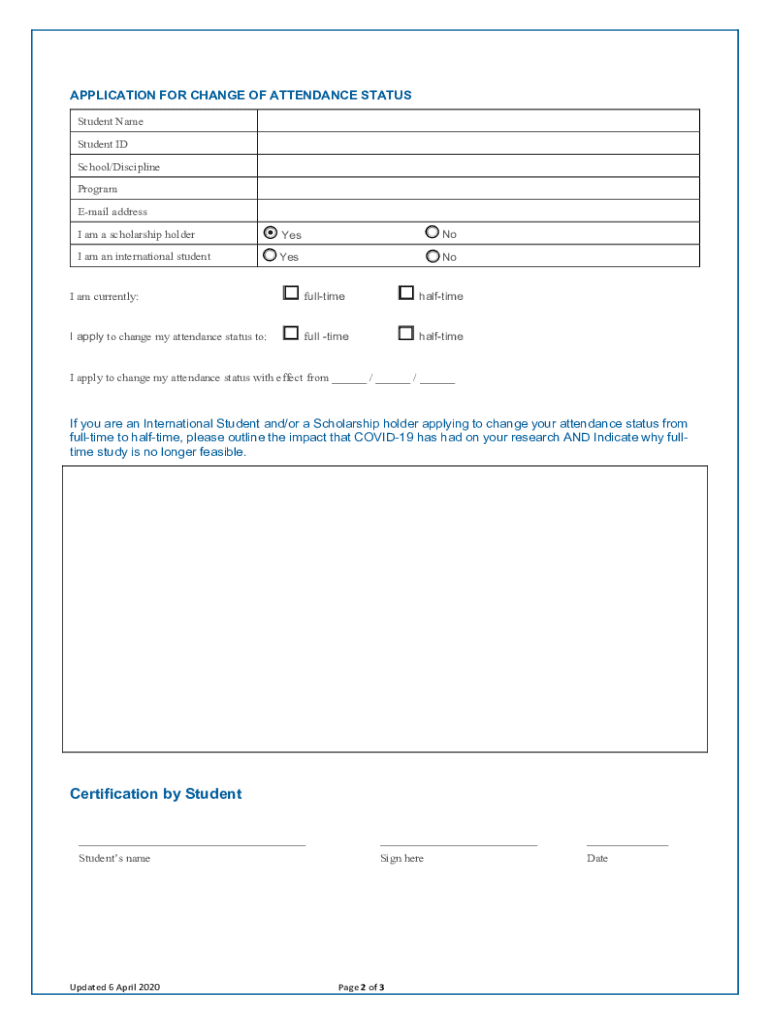 Returnthecompletedformtothe AdelaideGraduateCentre graduate.centre@adelaide.edu.auApplication for Change of Attendance Status Division of Research and Innovation This form applies if changing from