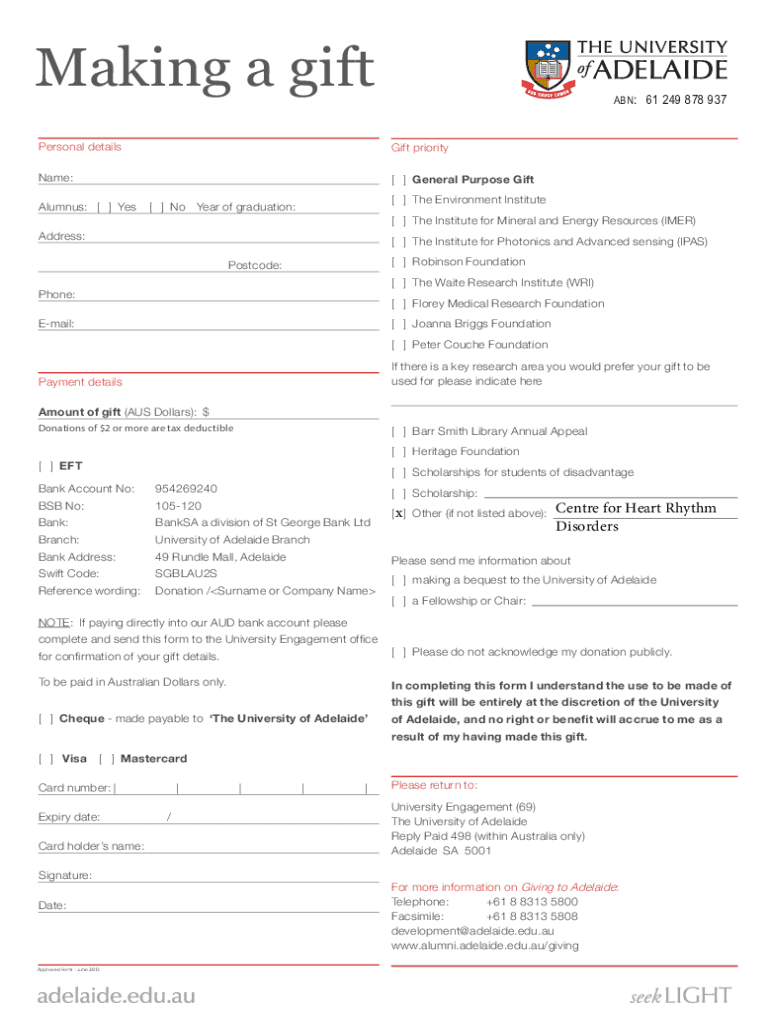 Making a gift ABN: 61 249 878 937Personal detailsGift priorityName:[ ] General Purpose GiftAlumnus: [ ] Yes[ ] Nosier of graduation:[ ] The Environment Institute [ ] The Institute for Mineral and