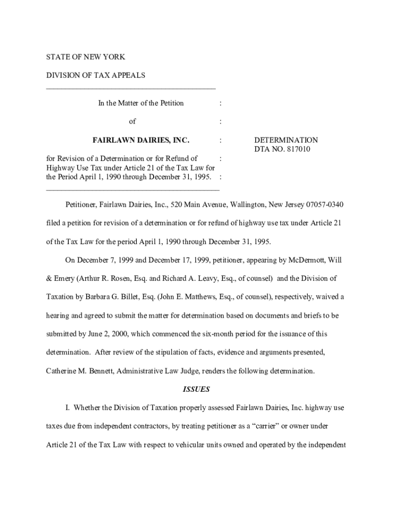 STATE OF NEW YORK DIVISION OF TAX APPEALS ___ In the Matter of the Petition of: :FAIR LAWN DAIRIES, INC.:DETERMINATION DTA NO. 817010for Revision of a Determination or for Refund of : Highway Use