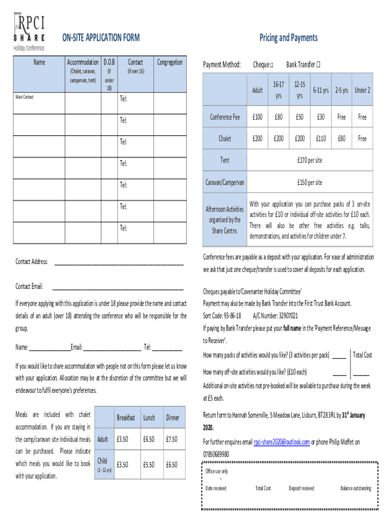 ONSITE APPLICATION FORM Repricing and PaymentsAccommodationD. O. Contact(Chalet, caravan, camper van, tent)(if under 18)(if over 16)Main ContactCongregationTel:Contact Email:Adult1617 yrs1215 yrs611