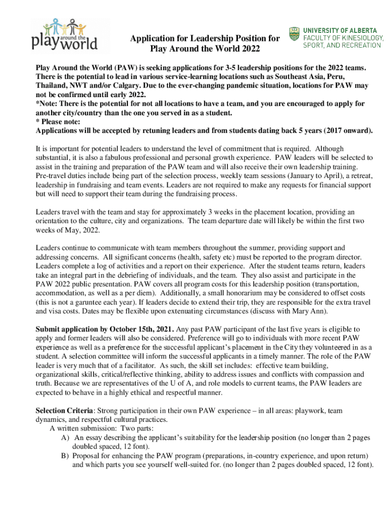 Application for Leadership Position for Play Around the World 2022 Play Around the World (PAW) is seeking applications for 35 leadership positions for the 2022 teams. There is the potential to lead